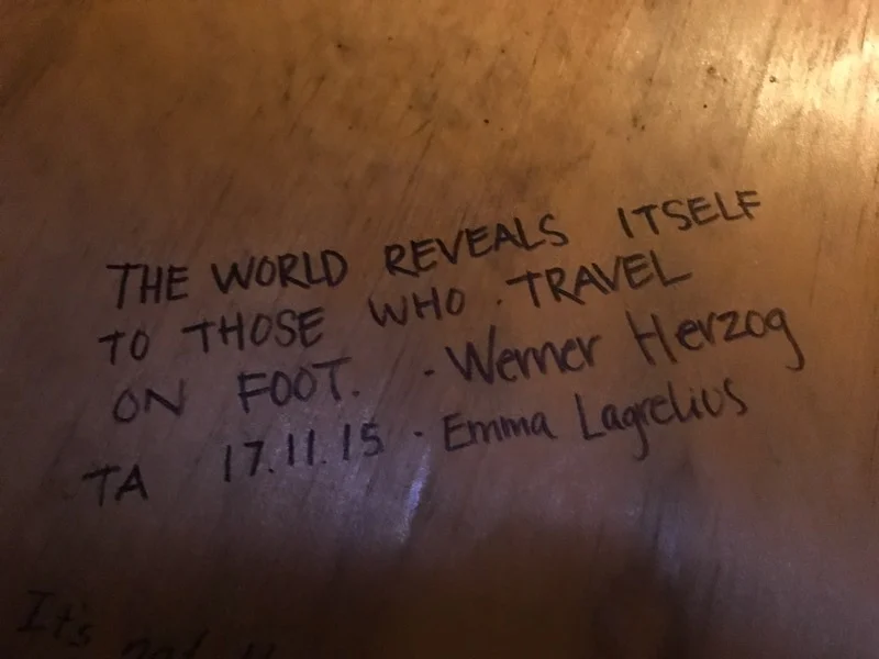 The bunk house is the exact length of a single mattress and the width of a mattress plus the door. There are windows on two sides, a shelf for each bunk and a light. The walls are covered in quotes and notes from TA trampers. I really enjoy reading them!