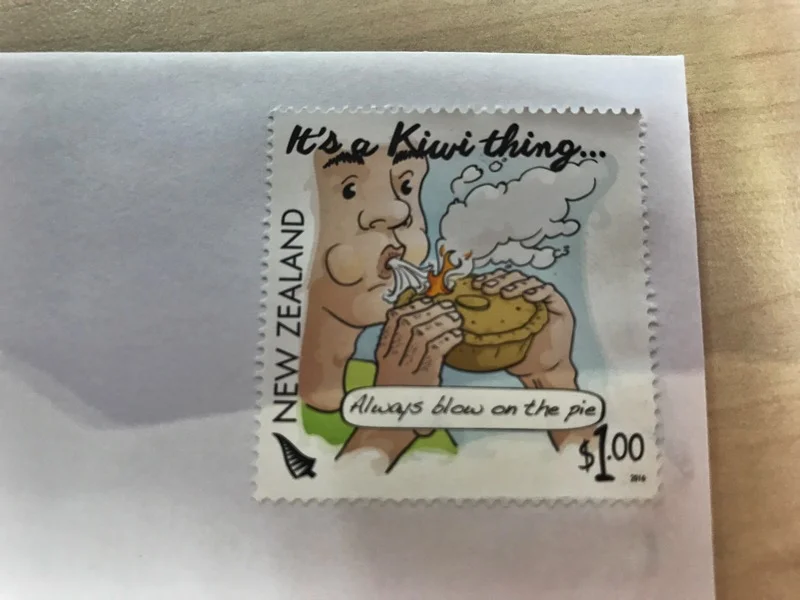 Stamps in NZ are so cool! These ones are just for domestic letters though so I can't send them to the US. Fish and Chips and these meat pies are by far my favorite foods in NZ