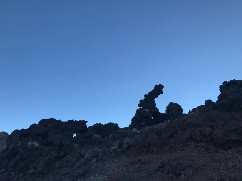It was beautiful and we were happy we'd be attempting to summit Mount Doom in these cooler, morning temperatures. The woman at reception last night had told us that the mountain took two and a half hours to summit and a half hour to go down. Those ratios seemed crazy to us until we stashed our packs behind some boulders and began to make our way up the volcano. The trail was entirely loose pebbles and boulders for much of the climb up. Until we realized there was some solid rocks we could use to climb up to our left, it was slow going. Even with the nice rock climbing, it was slow going because we were trying to be careful not to dislodge rocks and send them careening down to hikers below us. There were four other people climbing up with Kristen and I, and there was one person on his way down that must have begun his hike early to hit the summit at sunrise.