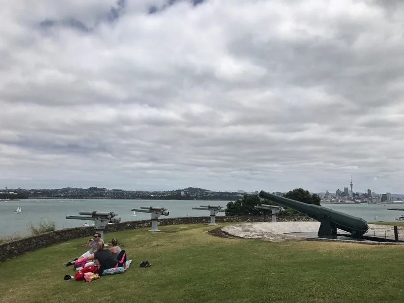 Picnic, old guns, and the Auckland City Skyline at North Head