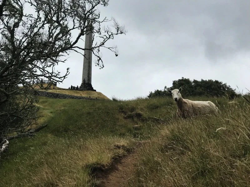The walk from North Head Devonport (and the ferry ride) is part of the TA, so I can cross those kilometers off my list. Then I walked the Coast to Coast Walkway to One Tree Hill, which is also part of the TA. It was a wonderful walk through streets and lots of parks. It goes through the Auckland Domain and Mount Eden. At Mount Eden there's a huge crater because it was a volcano. And from the top of it you can look out and see lots of other remains of volcanoes, the sky tower and the rest of the downtown skyline, as well as One Tree Hill, which is where I was headed next.