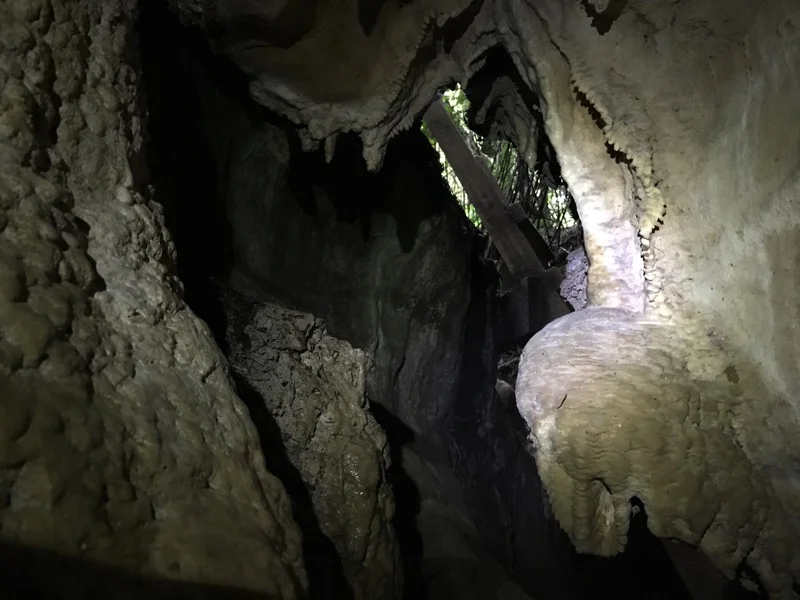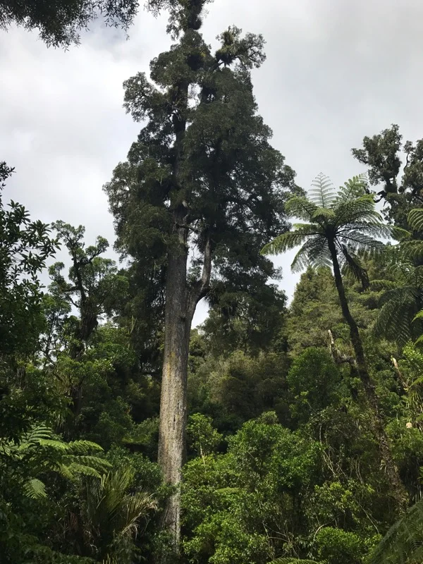 After waiting awhile for my tent to dry, the clouds weren't leaving the sky and I was restless to start my day. Around 9:30 I had everything packed and hit the trail. It didn't take me long at all to get to and explore the Kaniwhaniwha Cave, a limestone tunnel. And I made it to the kahikatea tree, the tallest found tree in New Zealand at 66.5 meters high, before I expected. There was a nice bench you could sit at and look at the tree, so I sat there and ate a snack.