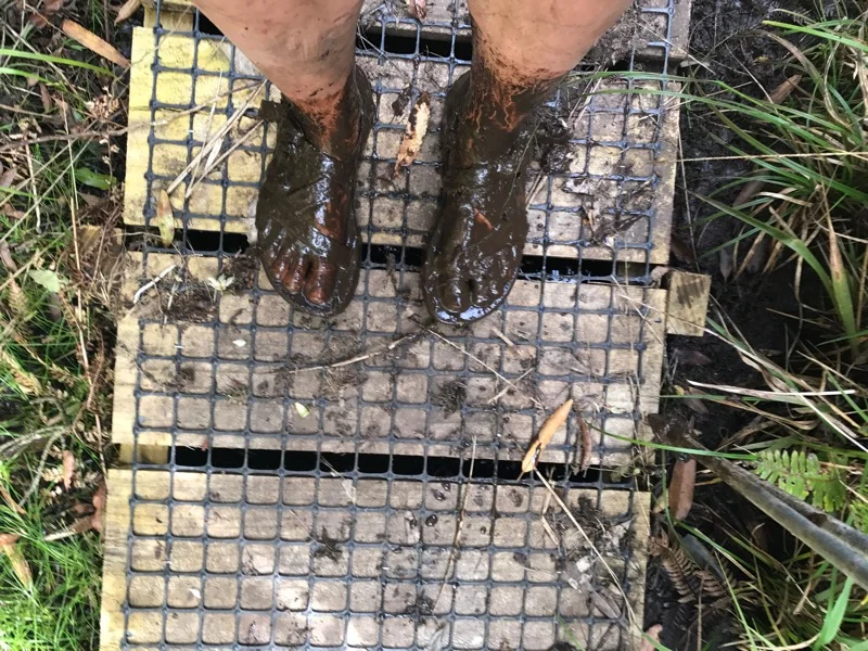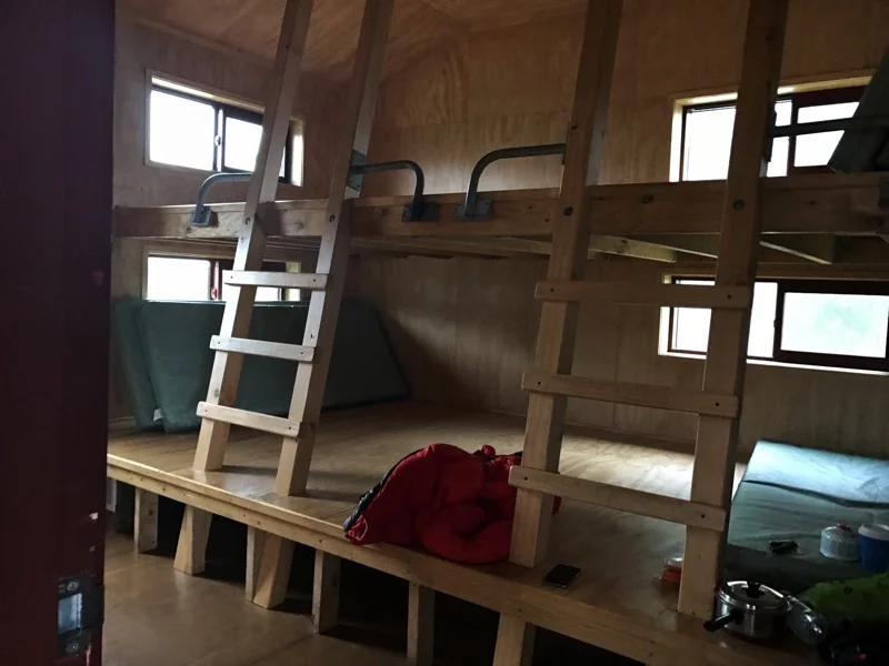 Robin was there and already asleep but Puff Puff and Julia saw me. They ran out to say hi and couldn't believe how muddy I was. My butt was covered in mud and I think Puff Puff took a photo - I'll add it here later if I get a hold of it. Luckily the hut was AMAZING and it even had a boot cleaning station. After complaining about the trail to Julia and Puff Puff I used the boot cleaning station as a leg cleaning station pretty effectively. The hut had multiple bathrooms, room for 20 people, 2 sinks inside, three big tables with information all over them, and platforms for camping (it's way too muddy up there to camp on the ground). The platform camping area even had a shelter with a table, benches and a drying line.