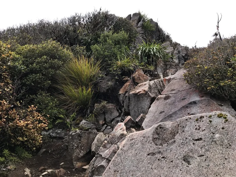 The weather still hadn't cleared but it wasn't really raining so I decided it was time to go. Mountains are often covered with clouds in the morning. Around 8:30 I started the trail down to the carpark. It wasn't easy, but it wasn't ever as bad as the last bit of the Bell Track. When I got to Pirongia Summit, it was still veiled in clouds, but I climbed the lookout tower anyway. After making it over Mahaukura Summit, I ran into a couple on their way to Pirongia for a day hike. We talked for a bit and I told them what had happened with my pole. They were from Hamilton and had parked at the parking lot I was heading to. They offered me a ride if I was still there when they finished their hike.