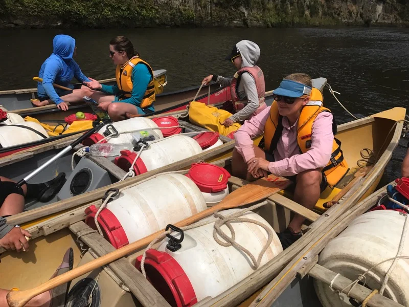 We made another chain to pass our barrels down to the canoes. They were all still there. Hooray! We had heard there wouldn't be much current today so we started the morning paddling for awhile. We tried to make a paddling flotilla with Julia and Puff Puff (where we tie our canoes together and paddle), and as canoes caught up to us the flotilla became bigger and bigger. Eventually we came to some rapids that looked pretty dicey to Marjolein and me so we broke away.