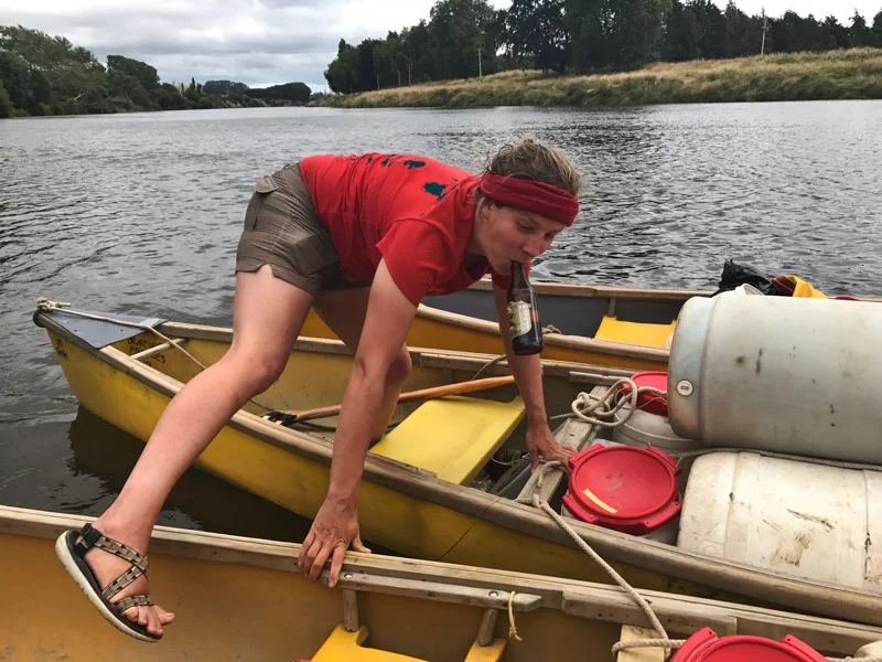 Marjolein tries to get out of our floatilla for snacks without spilling her drink.