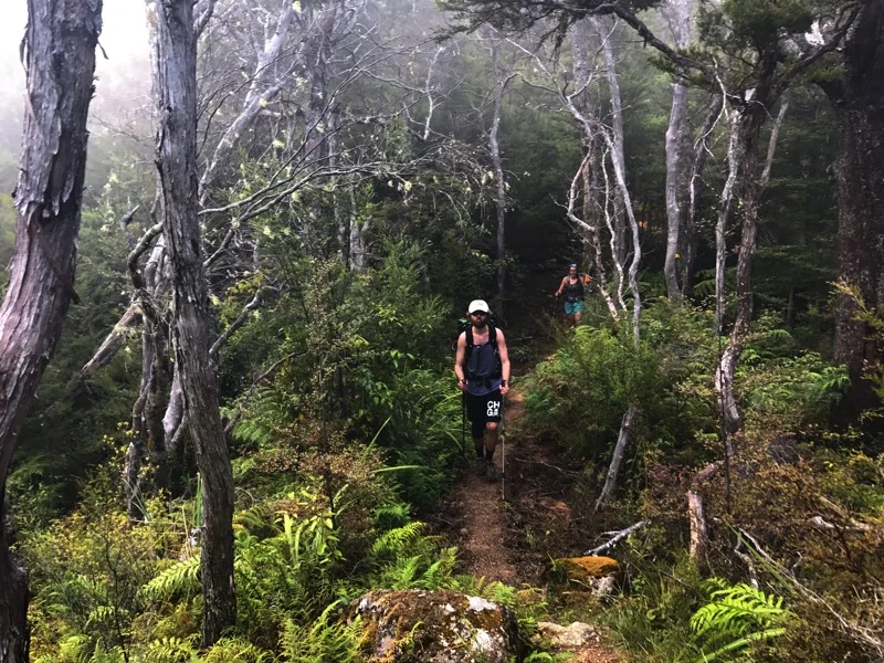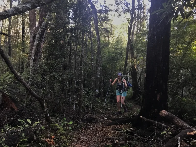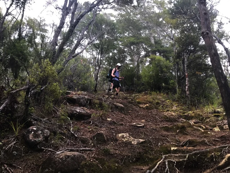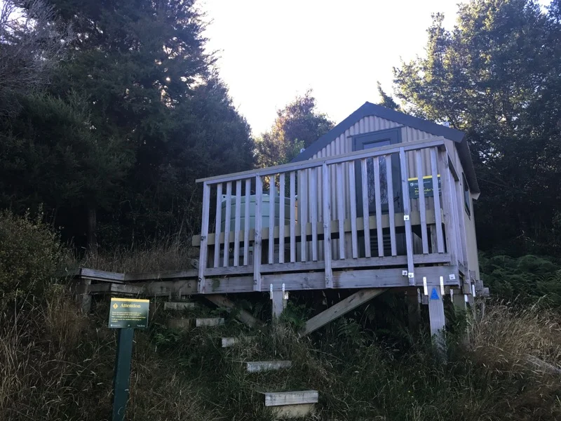 We kept following the Inland Trail. It was pretty similarly maintained to the section we walked yesterday. We crossed paths with another hiker who wasn't too social and got to the Moa Park Shelter around noon. It was a pretty icky shelter. Although it looked fine on the outside, the inside walls weren't finished and there were mouse droppings and (I'm assuming mouse) pee in the hut book. But it did have an outhouse close by and would have worked in a bad weather situation.