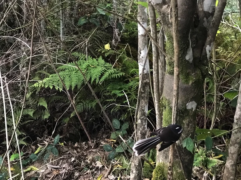 An out-of-focus fantail. They sometimes follow people on trails because their walking kicks up bugs and insects they like to eat (at least that's what I was told by a Kiwi).
