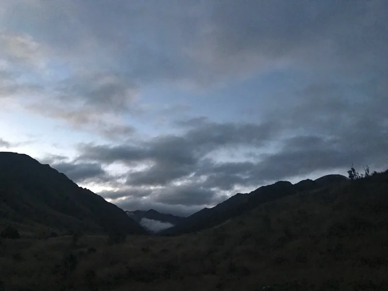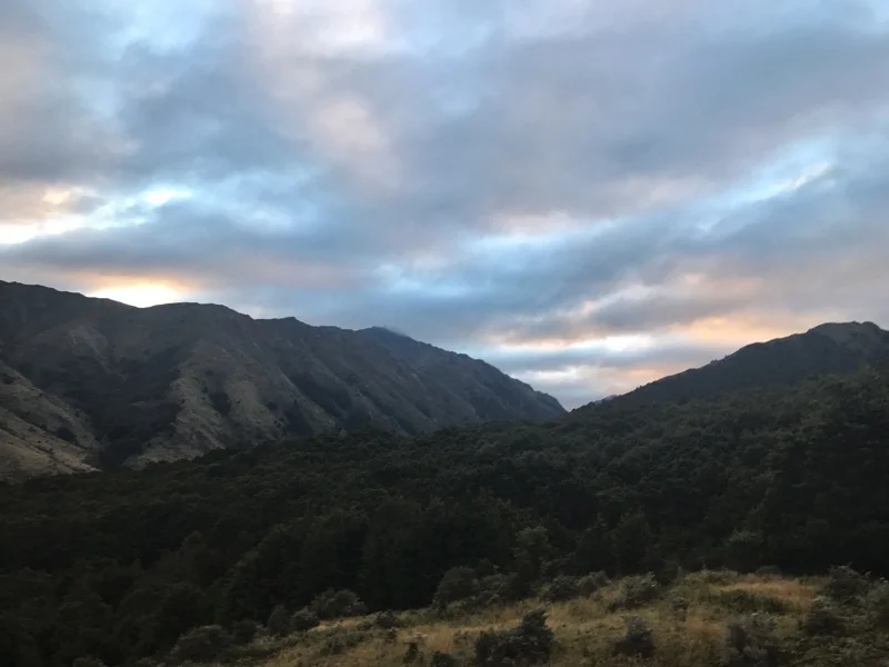 The downhill from there was nice. There were lots of rocks, a bit of scree and a bit of tussock. It was nice and easy. I made it to the campsite around 6 or so. It was dusk and Jen and Jeremy already had their tents up. They had put their tents downhill from the drop toilet and uphill from the big part of the river. It was a perfect spot.